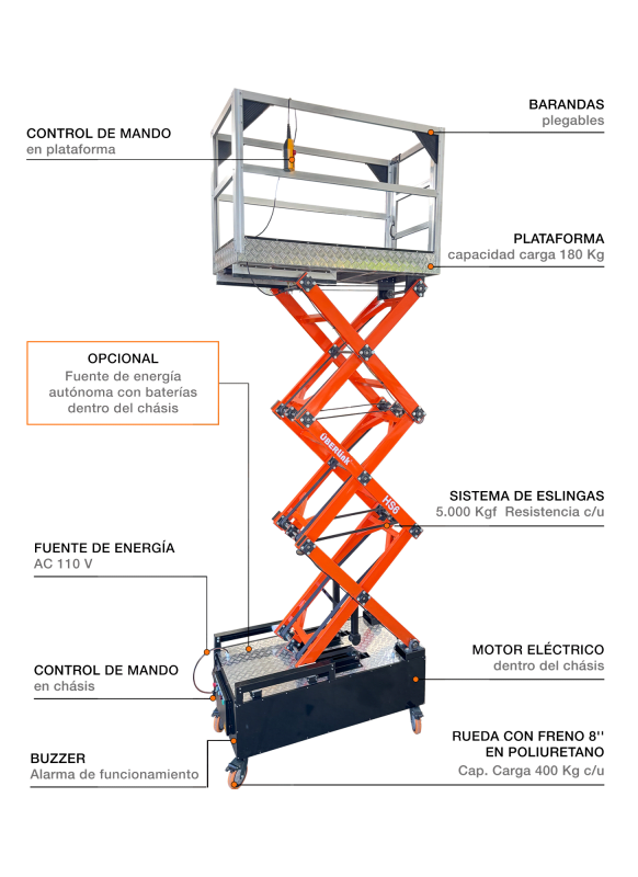 Diseñadas bajo parámetros de la norma americana ANSI/SAIA A92.3 fabricamos plataformas de tijera electromecánicas de propulsión manual con alcance de 8 metros de trabajo.